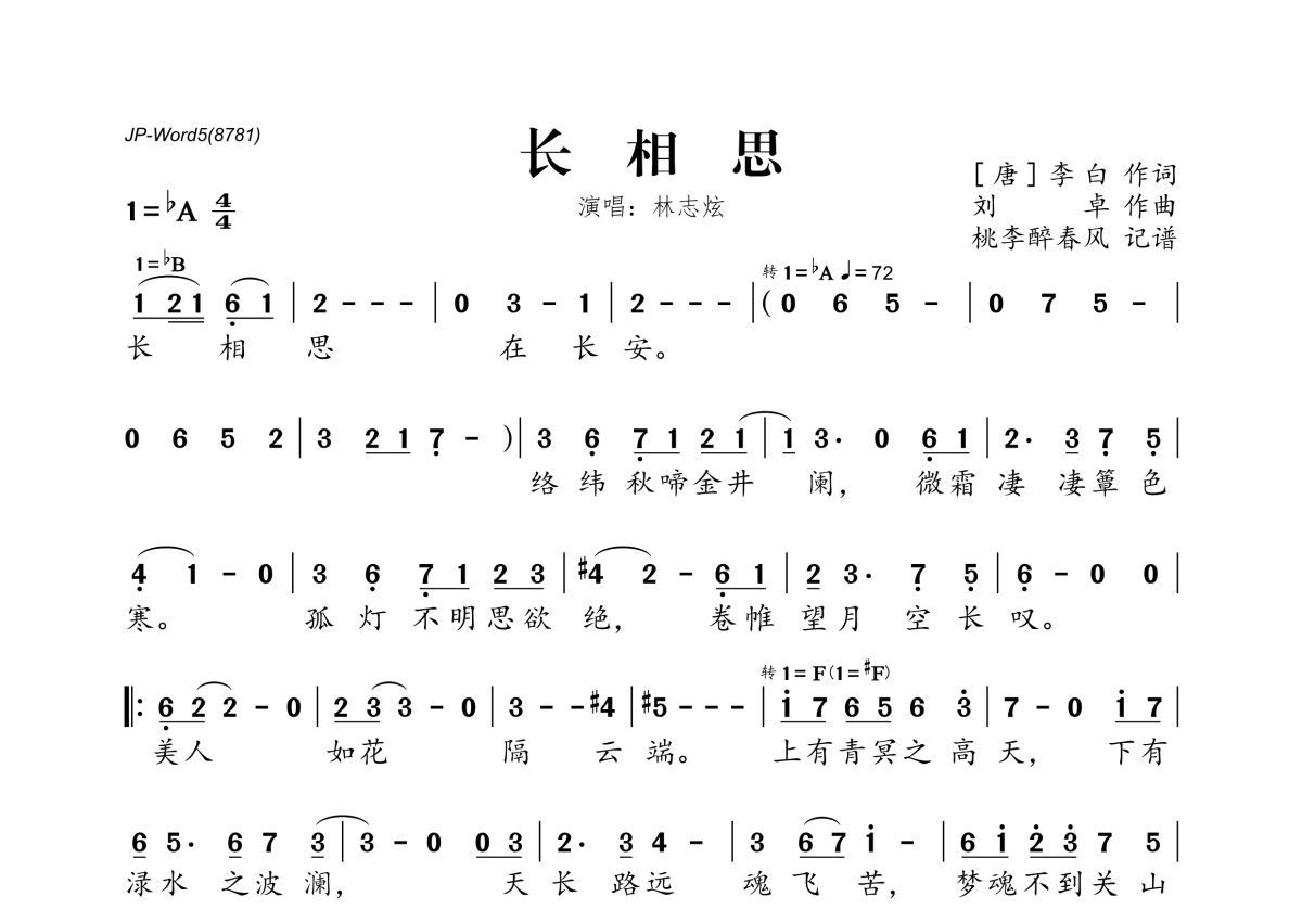 《长相思》是林志炫演唱的一首歌曲,拍号为4/4拍,歌曲速度为每分钟72拍,这份简谱共有一张高清图谱,图谱由 @桃李醉春风 编配上传。