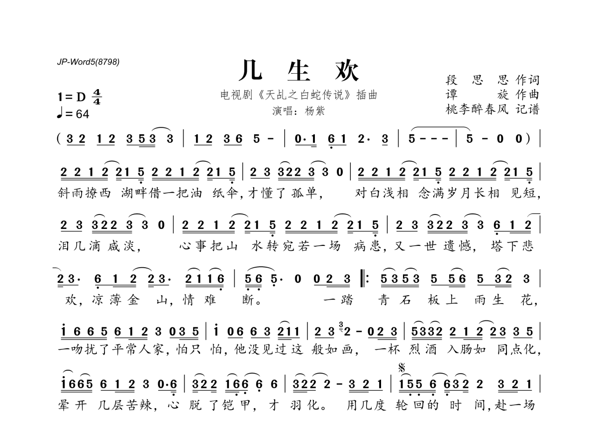 《几生欢》是杨紫演唱的一首歌曲,拍号为4/4拍,歌曲速度为每分钟64拍,这份简谱共有一张高清图谱,图谱由 @桃李醉春风 编配上传。