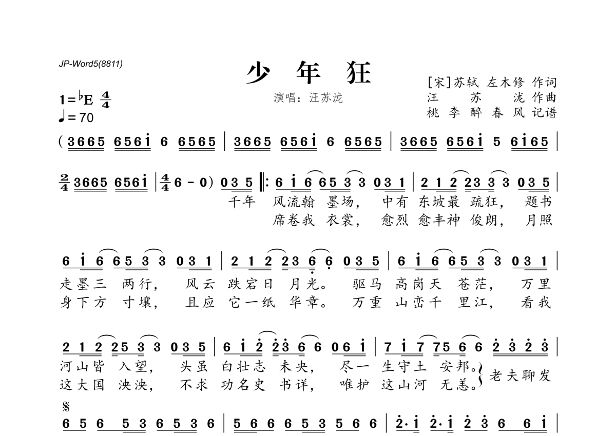 《少年狂》是汪苏泷演唱的一首歌曲,拍号为4/4拍,歌曲速度为每分钟70拍,这份简谱共有一张高清图谱,图谱由 @桃李醉春风 编配上传。