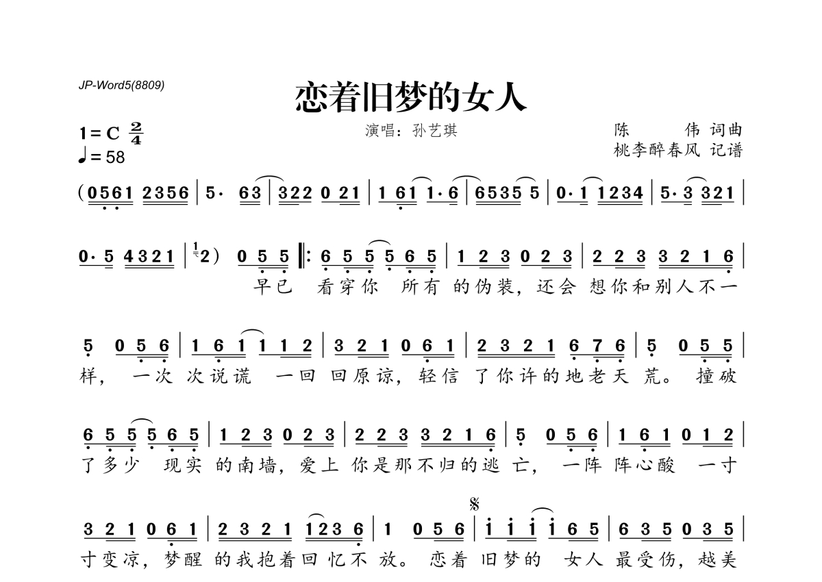 《恋着旧梦的女人》是孙艺琪演唱的一首歌曲,拍号为2/4拍,歌曲速度为每分钟58拍,这份简谱共有一张高清图谱,图谱由 @桃李醉春风 编配上传。