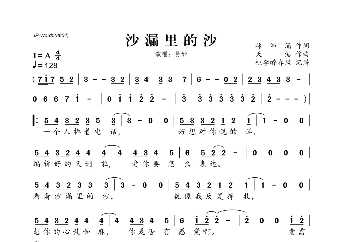 《沙漏里的沙》是曼妙演唱的一首歌曲,拍号为4/4拍,歌曲速度为每分钟128拍,这份简谱共有一张高清图谱,图谱由 @桃李醉春风 编配上传。