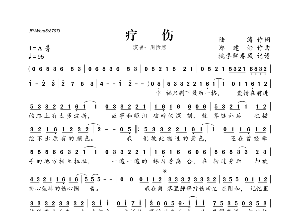 《疗伤》是周恬熙演唱的一首歌曲,拍号为4/4拍,歌曲速度为每分钟95拍,这份简谱共有一张高清图谱,图谱由 @桃李醉春风 编配上传。