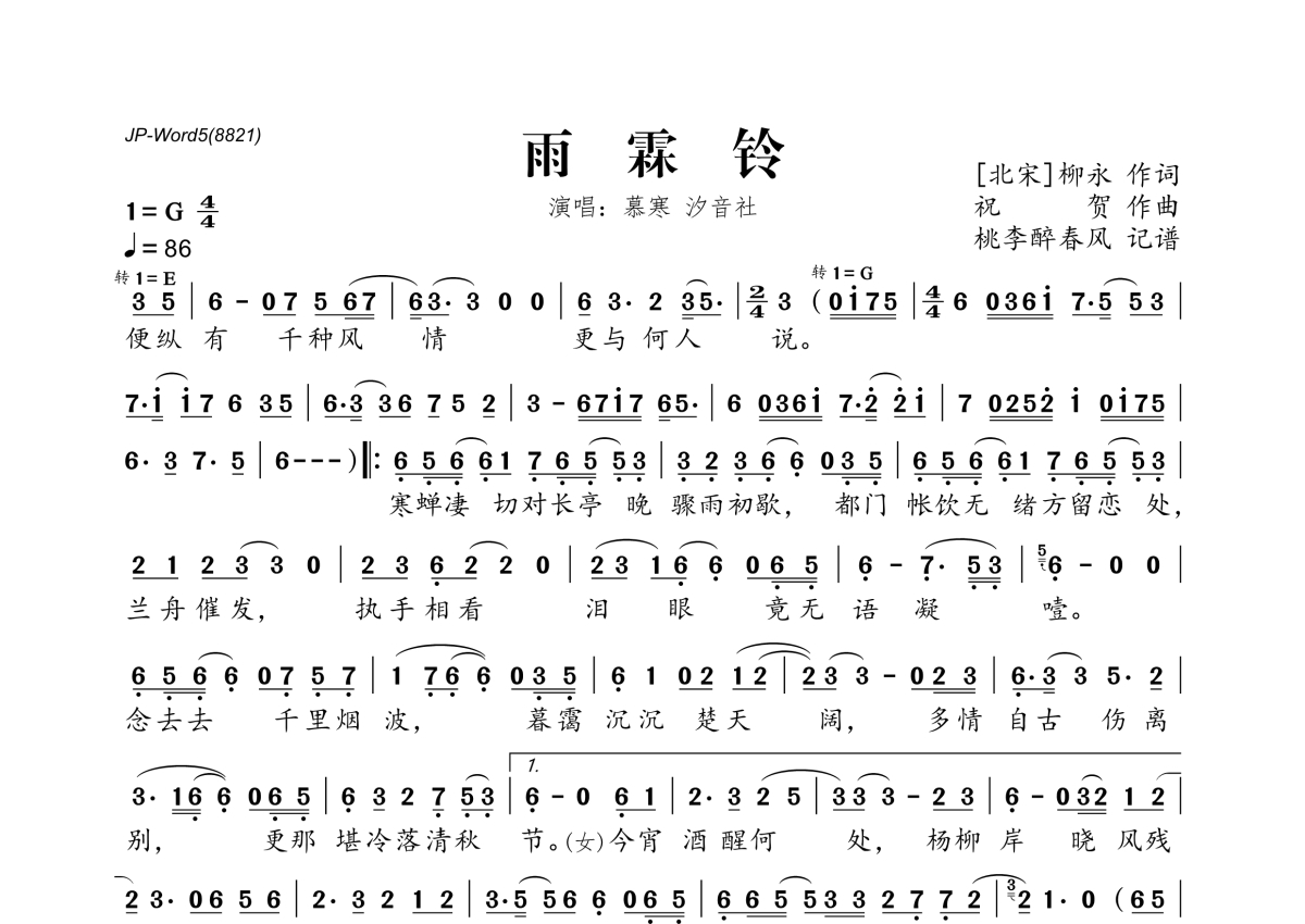 《雨霖铃》是慕寒&汐音社演唱的一首歌曲,拍号为4/4拍,歌曲速度为每分钟86拍,这份简谱共有一张高清图谱,图谱由 @桃李醉春风 编配上传。