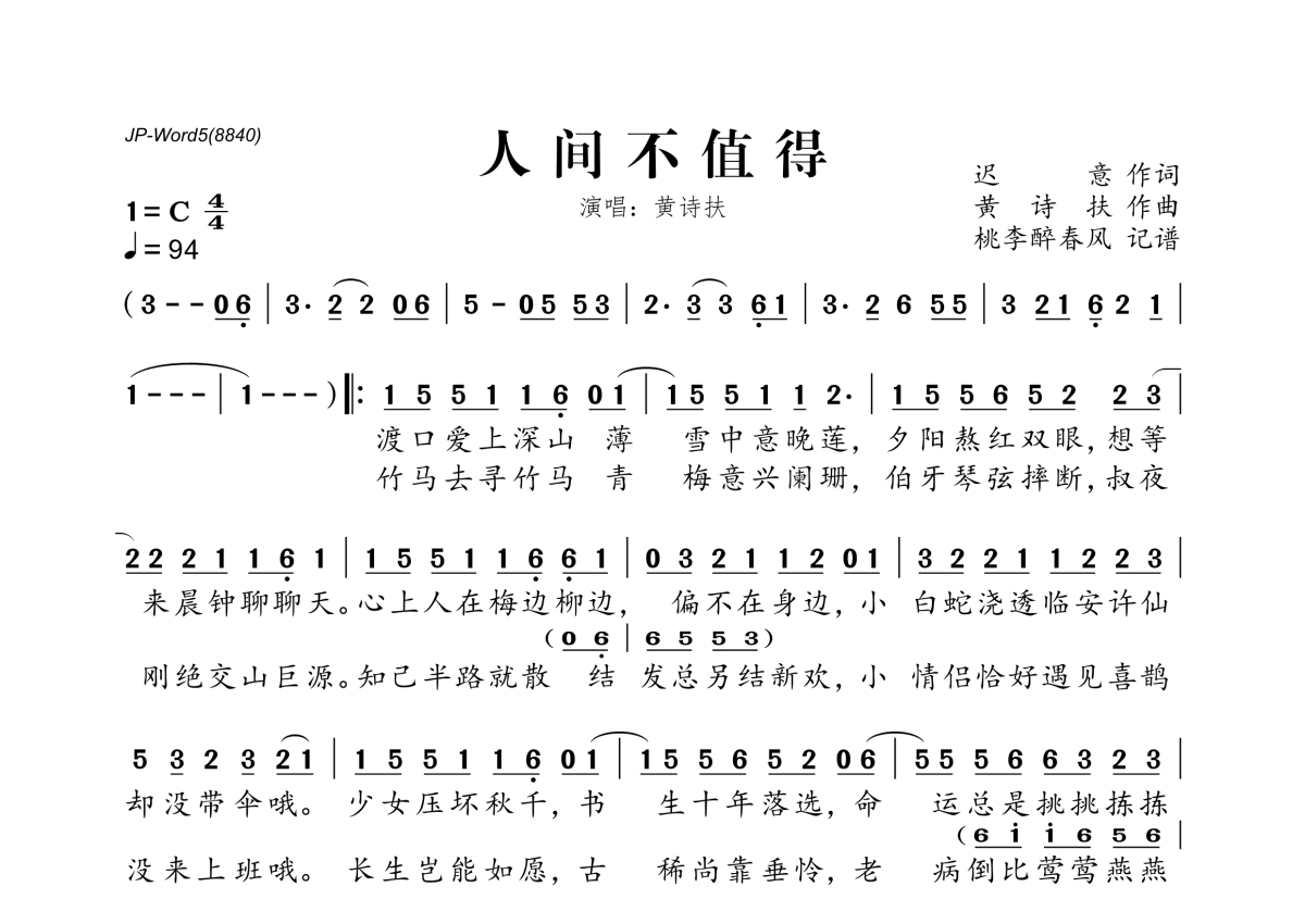 黄诗扶《人间不值得》简谱