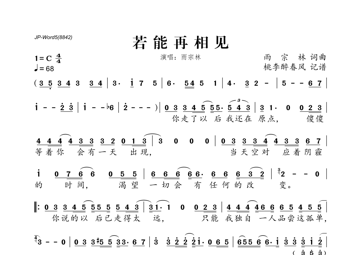 《若能再相见》是雨宗林演唱的一首歌曲,拍号为4/4拍,歌曲速度为每分钟68拍,这份简谱共有一张高清图谱,图谱由 @桃李醉春风 编配上传。