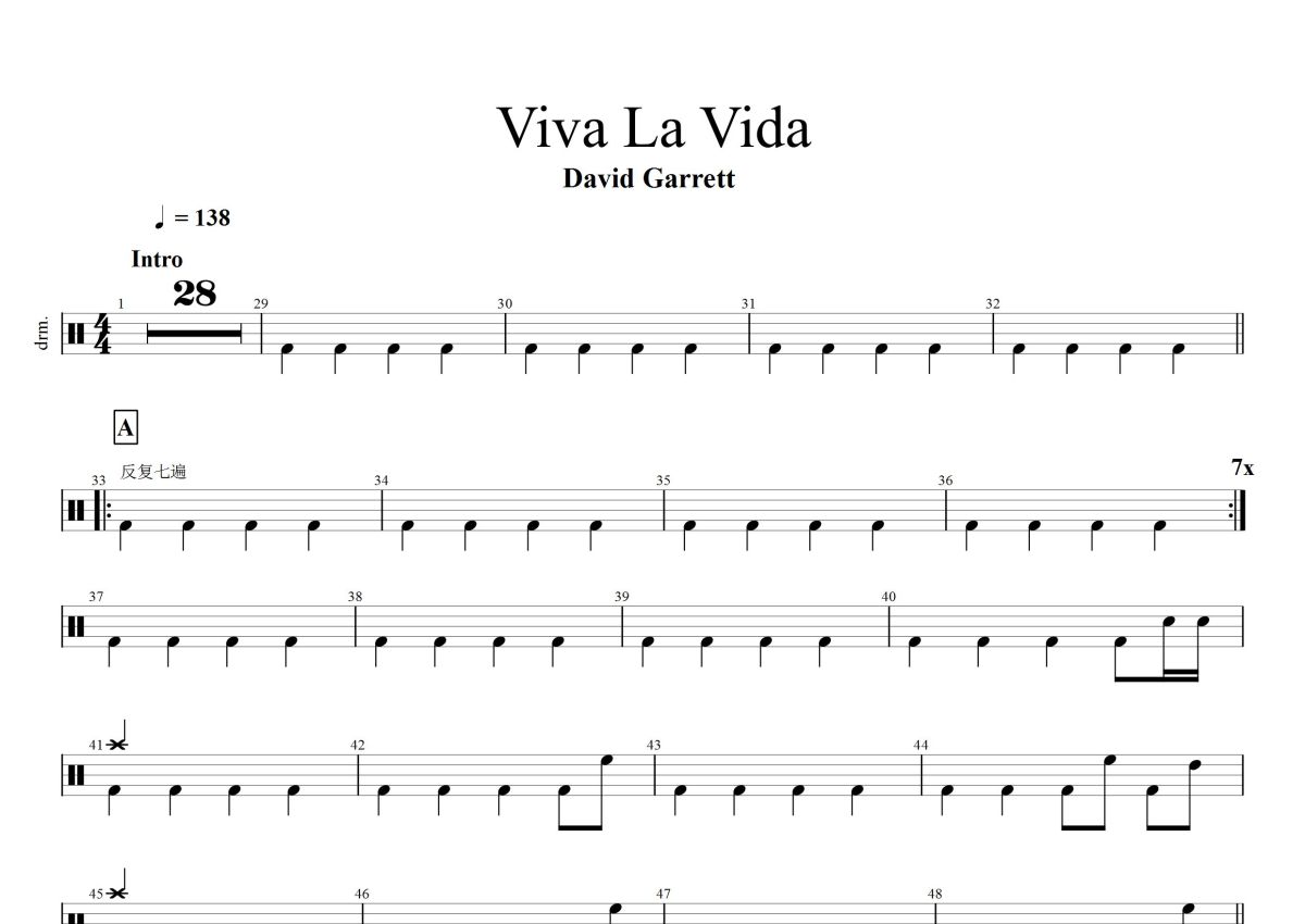 《Viva La Vida》是David Garrett演唱的一首歌曲,这份鼓谱共有两张高清图谱,图谱由 @打鼓谱 编配上传,图谱使用五线谱编配,使用这份Viva La Vida架子鼓谱,你将能够轻松地敲打出这首David Garrett的Viva La Vida,快来尝试吧。《Viva La Vida》(西班牙语:生命万岁)是英国摇滚乐队酷玩乐队演唱的歌曲,由克里斯·马汀、强尼·巴克兰、盖·贝瑞曼和威尔·查平填词谱曲,收录在酷玩乐队第四张录音室专辑《Viva La Vida Or Death And All His Friends》中,于2008年5月25日通过Parlophone唱片和Capitol唱片发布 。