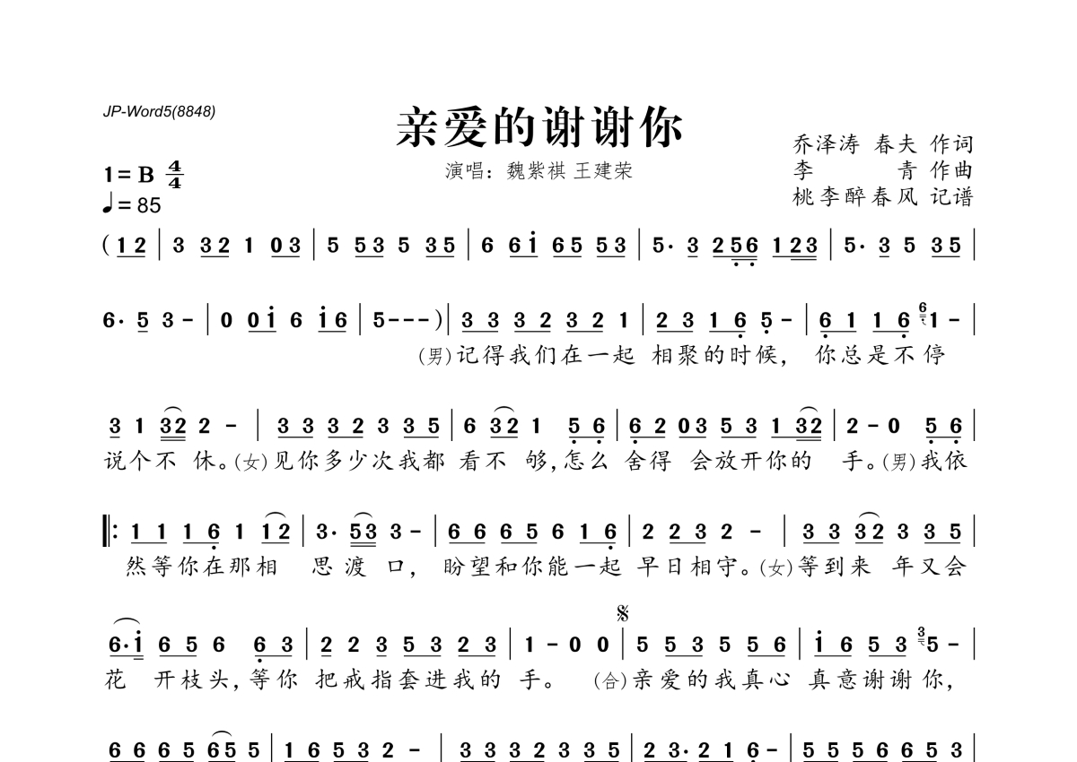 魏紫祺&王建荣《亲爱的谢谢你》简谱