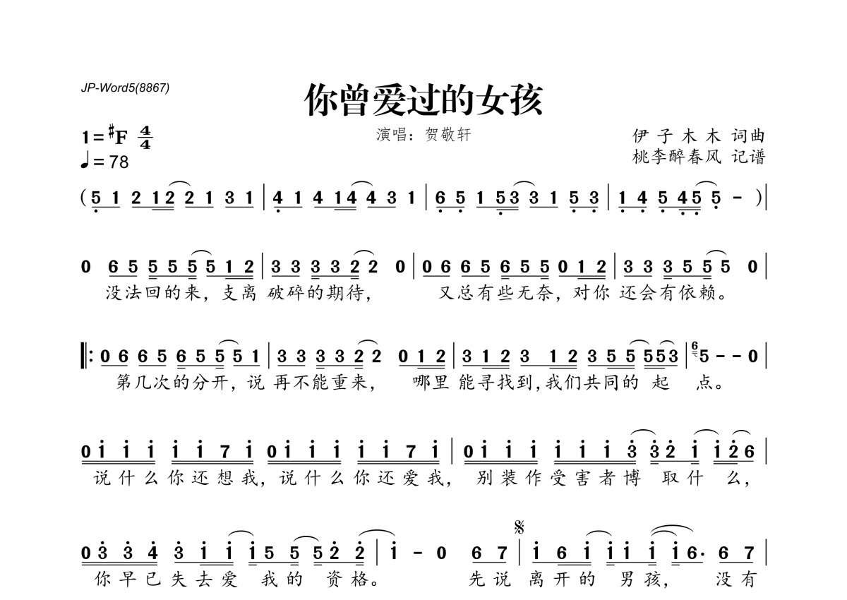 《你曾爱过的女孩》是贺敬轩演唱的一首歌曲,拍号为4/4拍,歌曲速度为每分钟78拍,这份简谱共有一张高清图谱,图谱由 @桃李醉春风 编配上传。