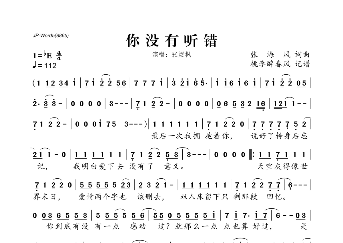 《你没有听错》是张煜枫演唱的一首歌曲,拍号为4/4拍,歌曲速度为每分钟112拍,这份简谱共有一张高清图谱,图谱由 @桃李醉春风 编配上传。