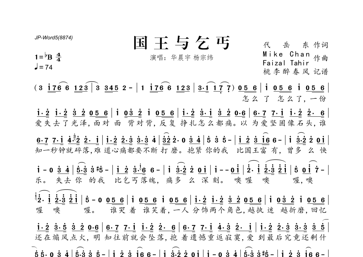 《国王与乞丐》是华晨宇&杨宗纬演唱的一首歌曲,拍号为4/4拍,歌曲速度为每分钟74拍,这份简谱共有一张高清图谱,图谱由 @桃李醉春风 编配上传。