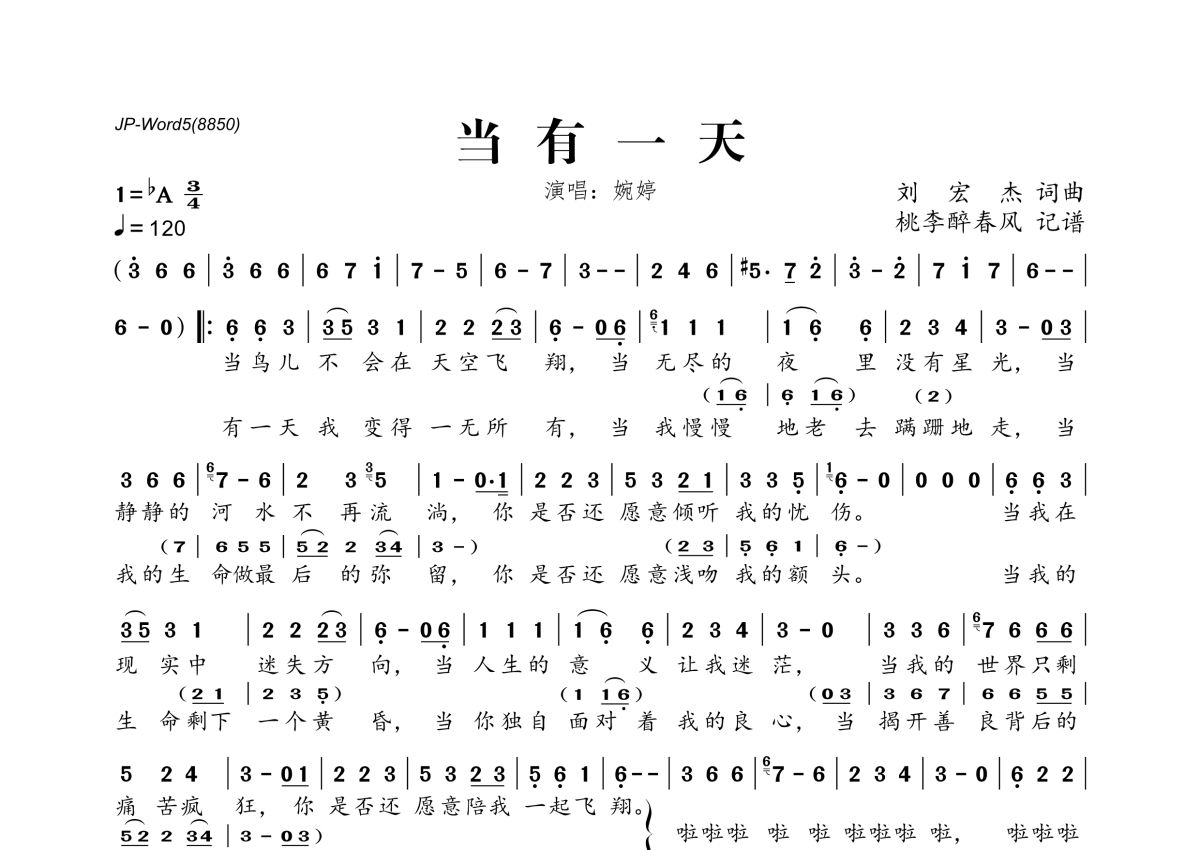 《当有一天》是婉婷演唱的一首歌曲,拍号为3/4拍,歌曲速度为每分钟120拍,这份简谱共有一张高清图谱,图谱由 @桃李醉春风 编配上传。
