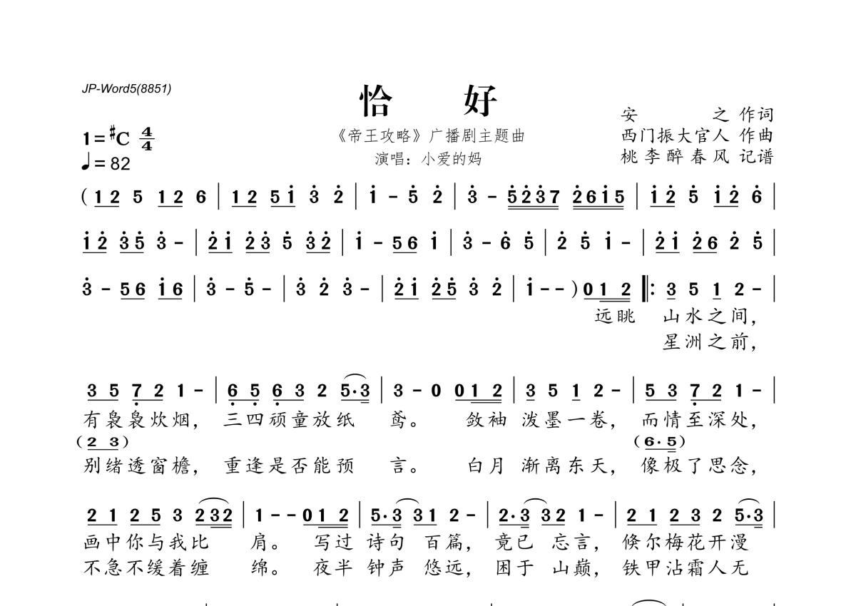 《恰好》是小爱的妈演唱的一首歌曲,拍号为4/4拍,歌曲速度为每分钟82拍,这份简谱共有一张高清图谱,图谱由 @桃李醉春风 编配上传。