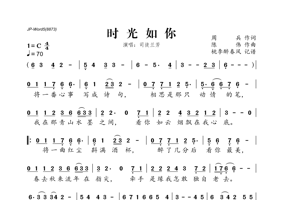《时光如你》是司徒兰芳演唱的一首歌曲,拍号为4/4拍,歌曲速度为每分钟70拍,这份简谱共有一张高清图谱,图谱由 @桃李醉春风 编配上传。