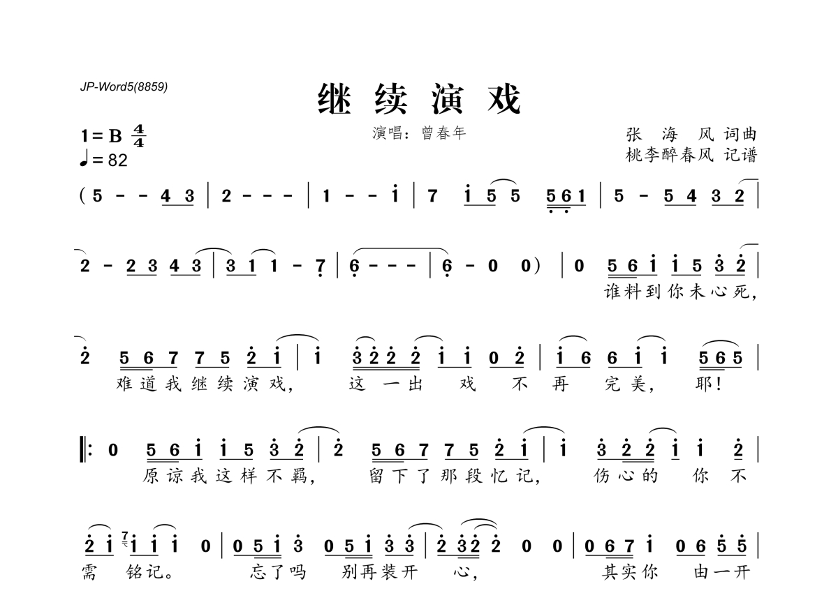 《继续演戏》是曾春年演唱的一首歌曲,拍号为4/4拍,歌曲速度为每分钟82拍,这份简谱共有一张高清图谱,图谱由 @桃李醉春风 编配上传。