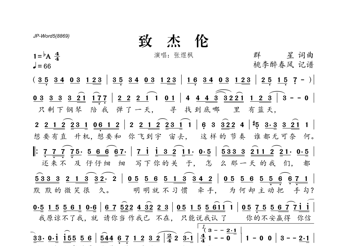 《致杰伦》是张煜枫演唱的一首歌曲,拍号为4/4拍,歌曲速度为每分钟66拍,这份简谱共有一张高清图谱,图谱由 @桃李醉春风 编配上传。