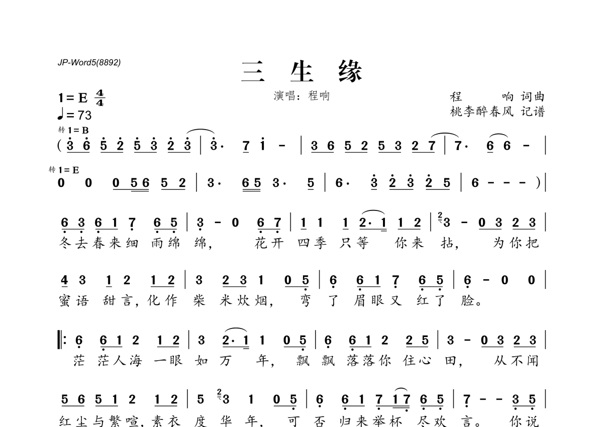 《三生缘》是程响演唱的一首歌曲,拍号为4/4拍,歌曲速度为每分钟73拍,这份简谱共有一张高清图谱,图谱由 @桃李醉春风 编配上传。