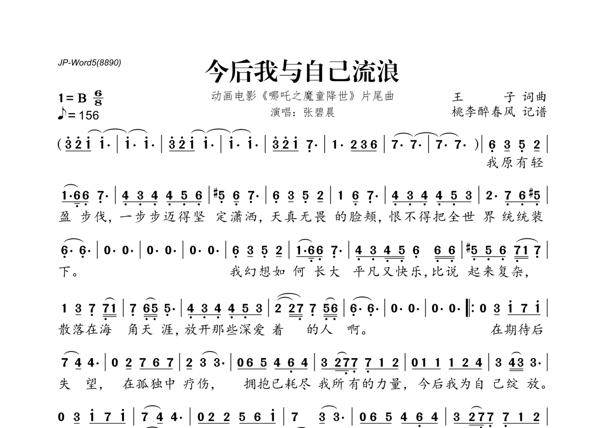 《今后我与自己流浪》是张碧晨演唱的一首歌曲,拍号为6/8拍,歌曲速度为每分钟156拍,这份简谱共有一张高清图谱,图谱由 @桃李醉春风 编配上传。