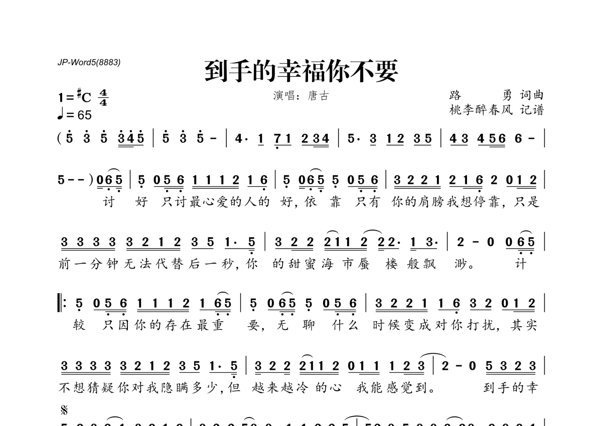 《到手的幸福你不要》是唐古演唱的一首歌曲,拍号为4/4拍,歌曲速度为每分钟65拍,这份简谱共有一张高清图谱,图谱由 @桃李醉春风 编配上传。