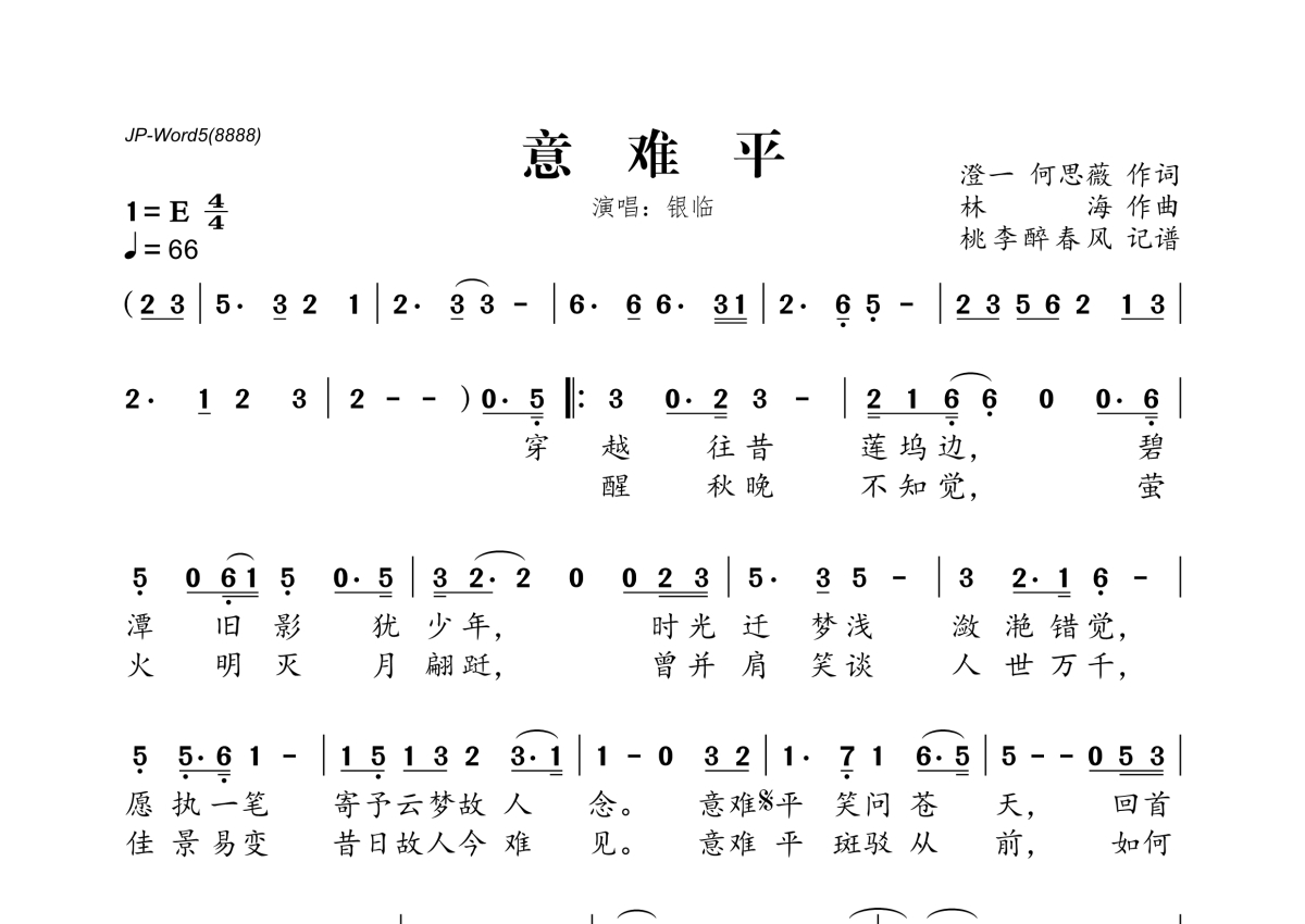 《意难平》是银临演唱的一首歌曲,拍号为4/4拍,歌曲速度为每分钟66拍,这份简谱共有一张高清图谱,图谱由 @桃李醉春风 编配上传。