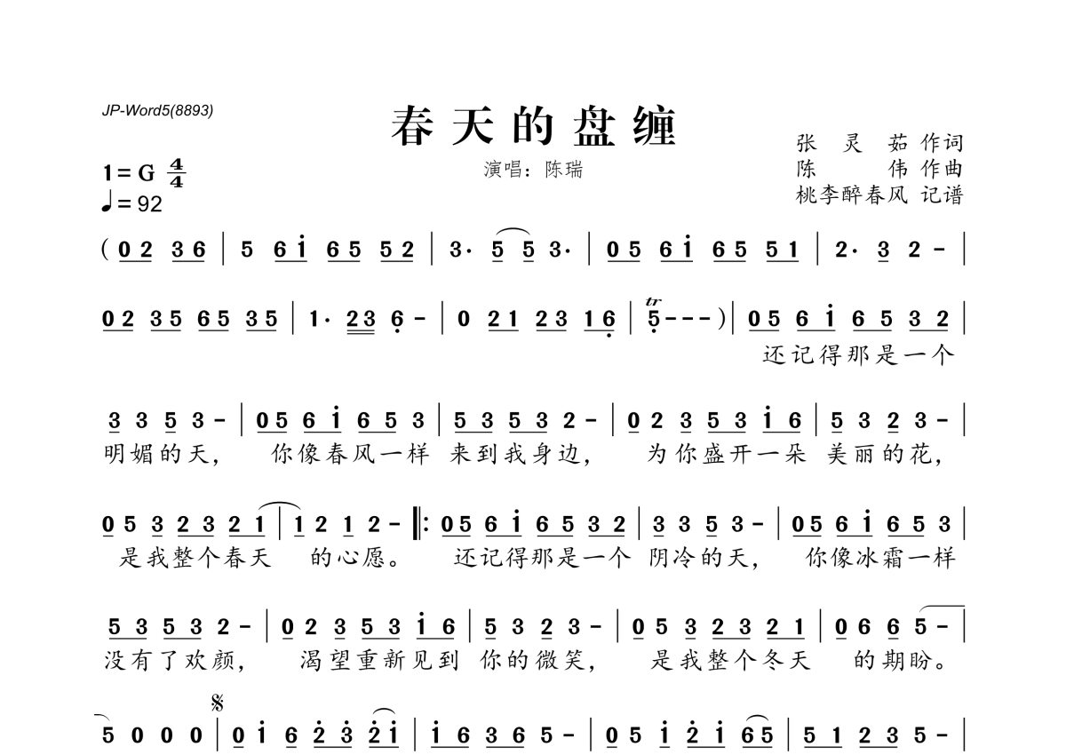 《春天的盘缠》是陈瑞演唱的一首歌曲,拍号为4/4拍,歌曲速度为每分钟92拍,这份简谱共有一张高清图谱,图谱由 @桃李醉春风 编配上传。