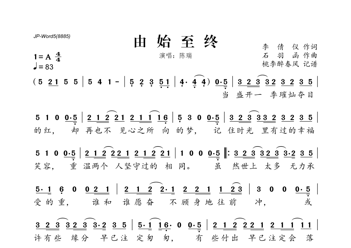 《由始至终》是陈瑞演唱的一首歌曲,拍号为4/4拍,歌曲速度为每分钟83拍,这份简谱共有一张高清图谱,图谱由 @桃李醉春风 编配上传。