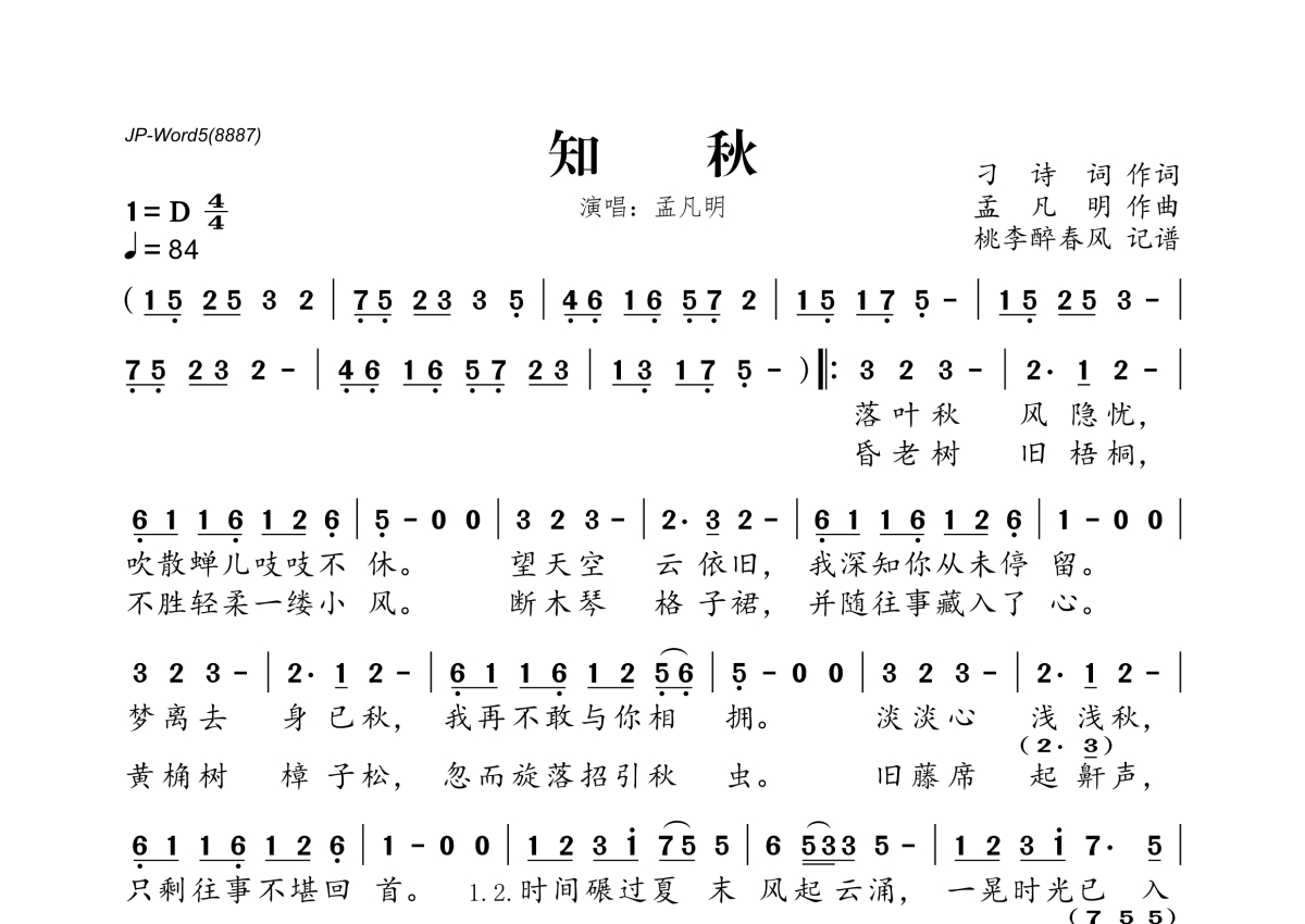 《知秋》是孟凡明演唱的一首歌曲,拍号为4/4拍,歌曲速度为每分钟84拍,这份简谱共有一张高清图谱,图谱由 @桃李醉春风 编配上传。