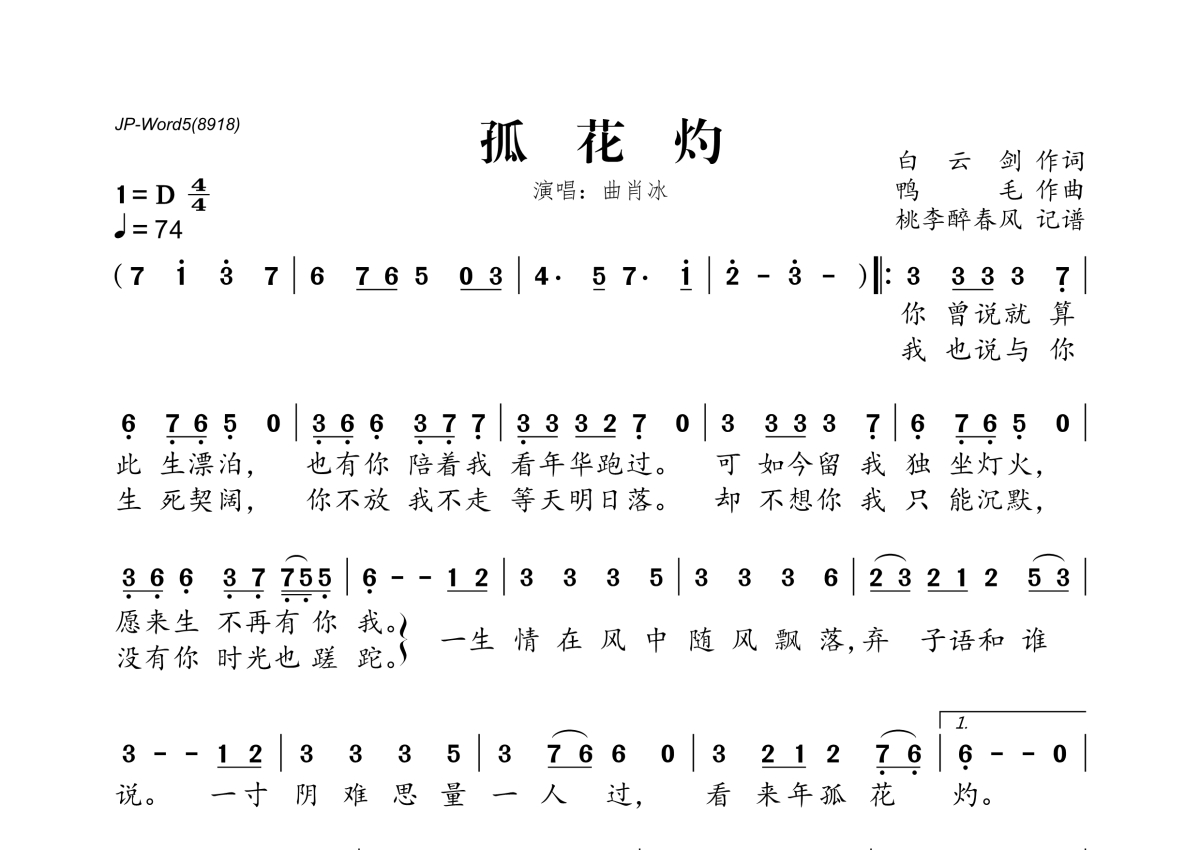 曲肖冰《孤花灼》简谱