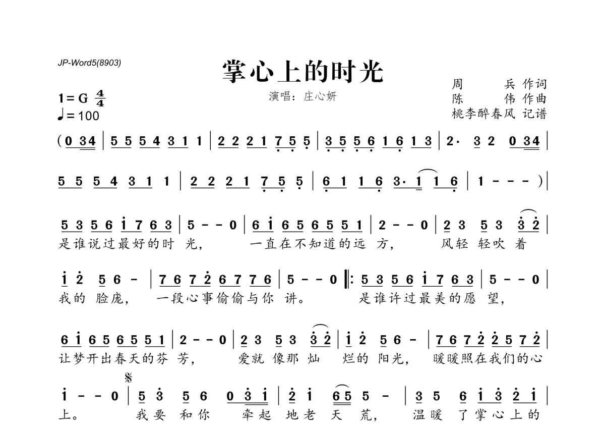 《掌心上的时光》是庄心妍演唱的一首歌曲,拍号为4/4拍,歌曲速度为每分钟100拍,这份简谱共有一张高清图谱,图谱由 @桃李醉春风 编配上传。