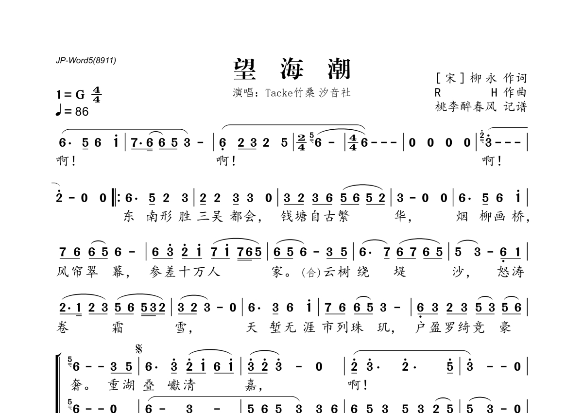 《望海潮》是Tacke竹桑&汐音社演唱的一首歌曲,拍号为4/4拍,歌曲速度为每分钟86拍,这份简谱共有一张高清图谱,图谱由 @桃李醉春风 编配上传。