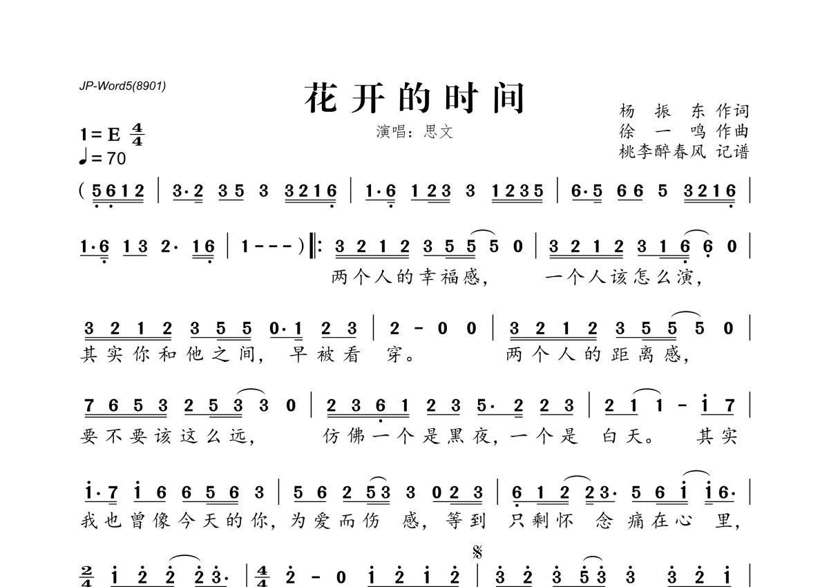 《花开的时间》是思文演唱的一首歌曲,拍号为4/4拍,歌曲速度为每分钟70拍,这份简谱共有一张高清图谱,图谱由 @桃李醉春风 编配上传。