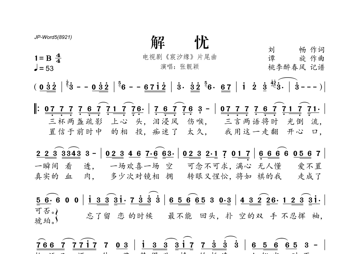 《解忧》是张靓颖演唱的一首歌曲,拍号为4/4拍,歌曲速度为每分钟53拍,这份简谱共有一张高清图谱,图谱由 @桃李醉春风 编配上传。