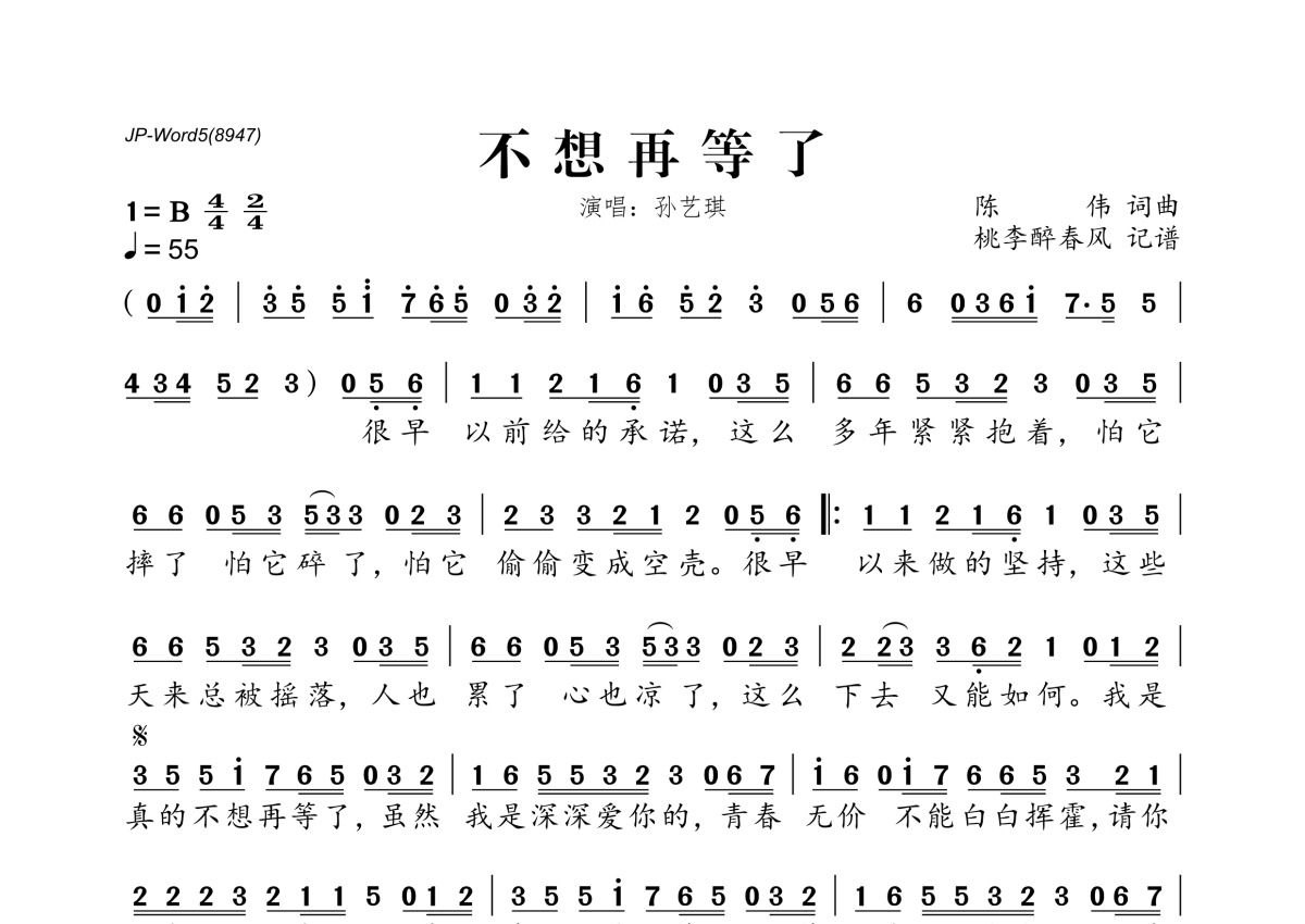 《不想再等了》是孙艺琪演唱的一首歌曲,拍号为4/4拍,歌曲速度为每分钟55拍,这份简谱共有一张高清图谱,图谱由 @桃李醉春风 编配上传。