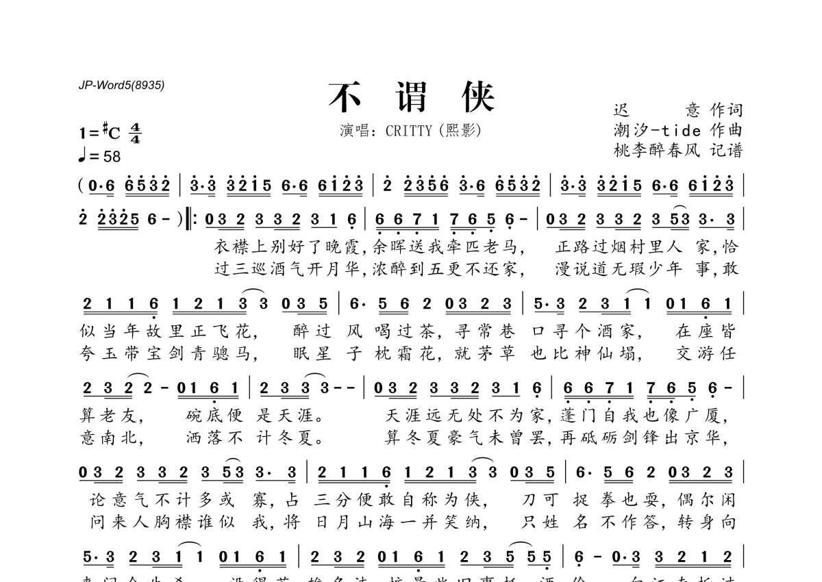 《不谓侠》是CRITTY(熙影)演唱的一首歌曲,拍号为4/4拍,歌曲速度为每分钟58拍,这份简谱共有一张高清图谱,图谱由 @桃李醉春风 编配上传。
