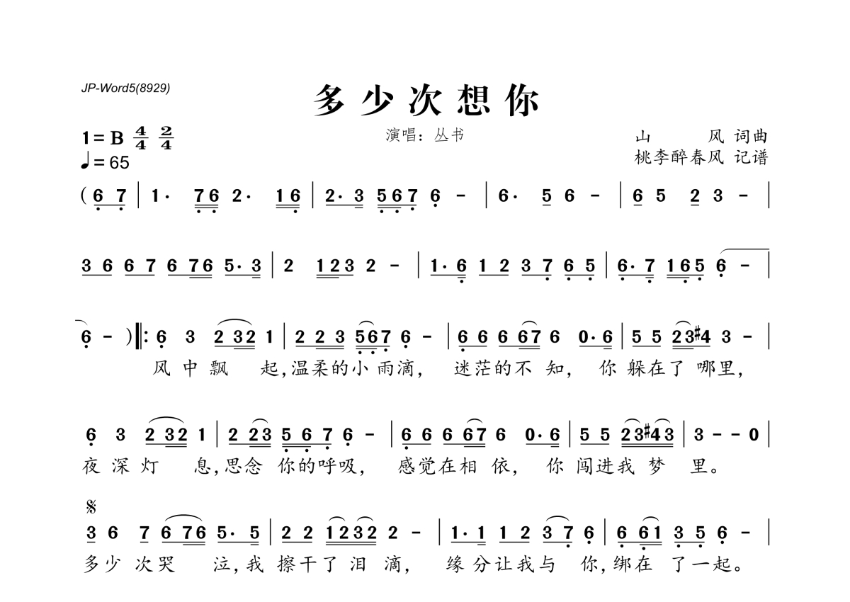 《多少次想你》是丛书演唱的一首歌曲,拍号为4/4拍,歌曲速度为每分钟65拍,这份简谱共有一张高清图谱,图谱由 @桃李醉春风 编配上传。