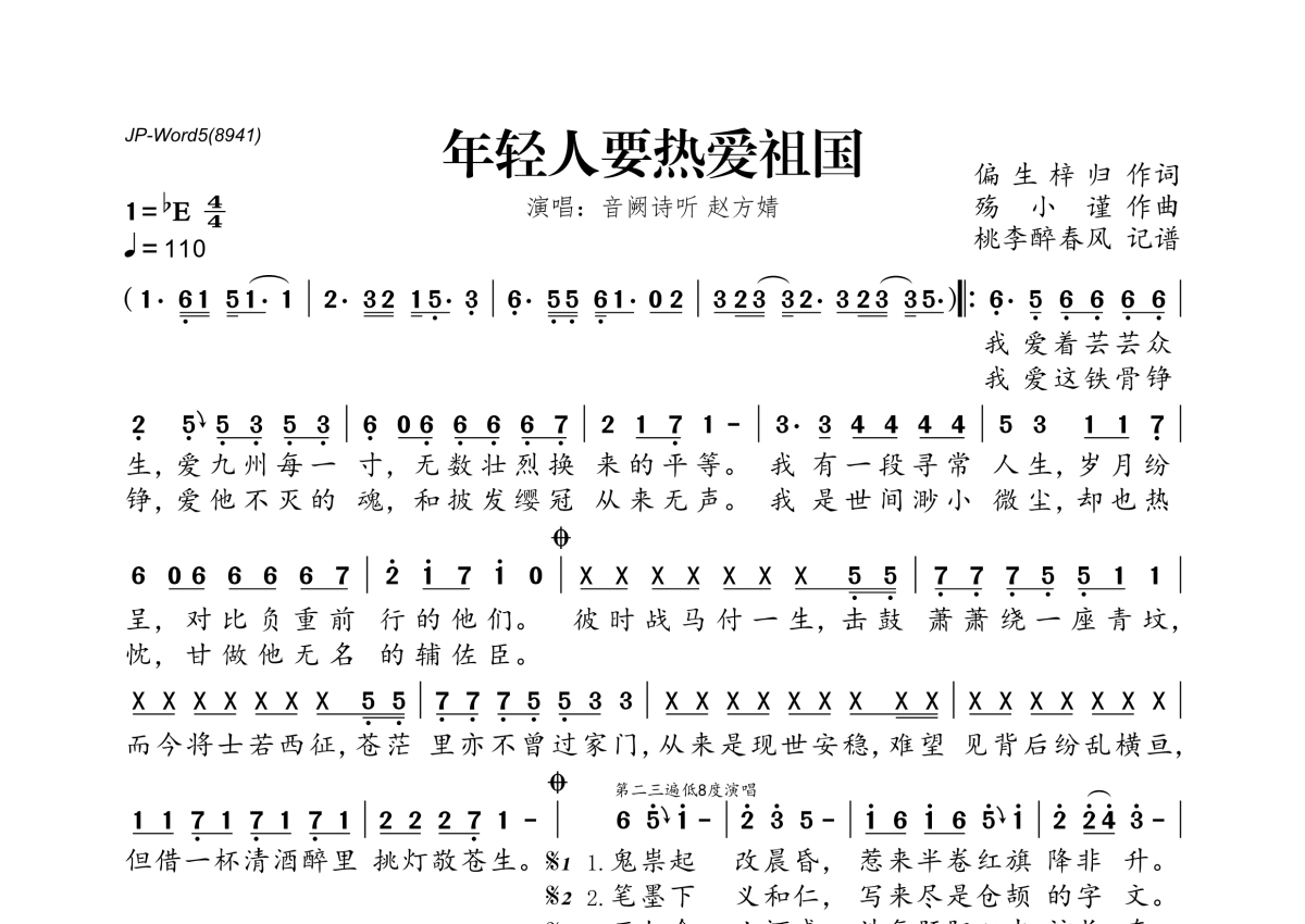《年轻人要热爱祖国》是音阙诗听&赵方婧演唱的一首歌曲,拍号为4/4拍,歌曲速度为每分钟110拍,这份简谱共有一张高清图谱,图谱由 @桃李醉春风 编配上传。