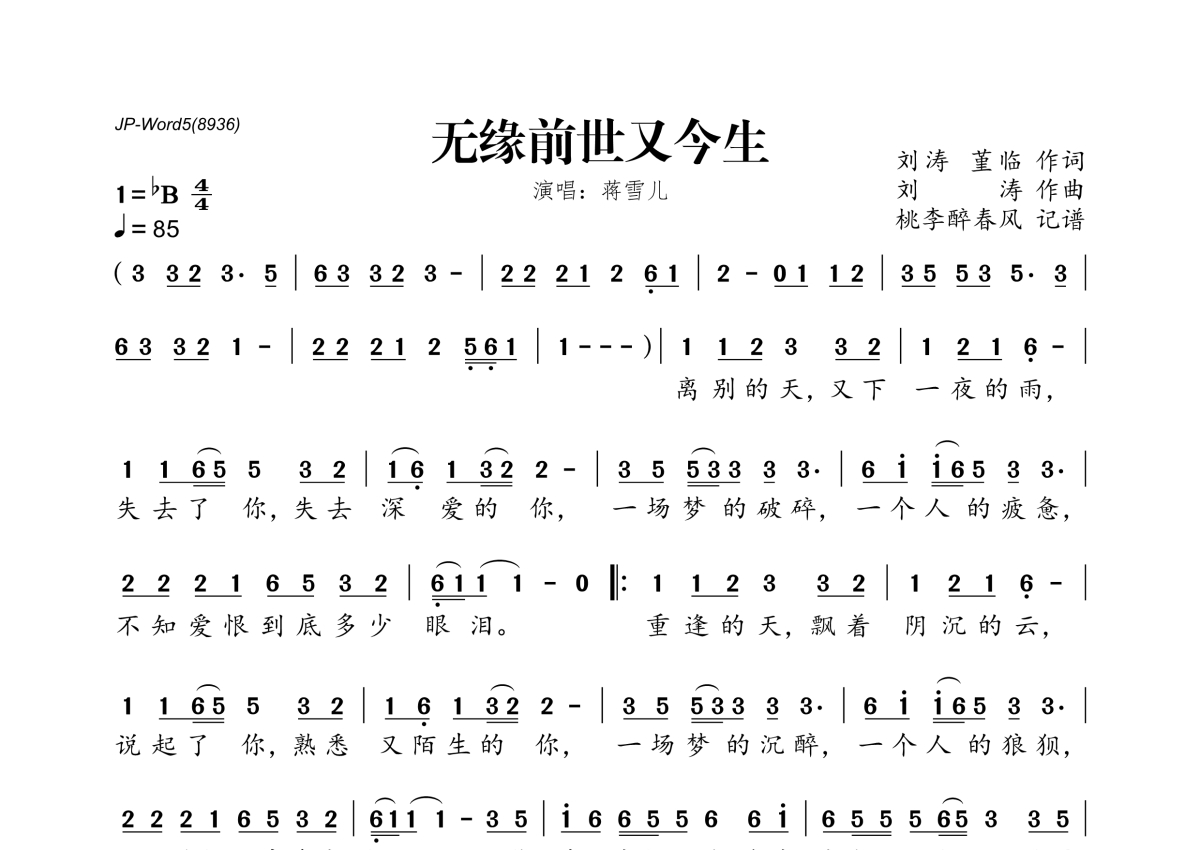 《无缘前世又今生》是蒋雪儿演唱的一首歌曲,拍号为4/4拍,歌曲速度为每分钟85拍,这份简谱共有一张高清图谱,图谱由 @桃李醉春风 编配上传。