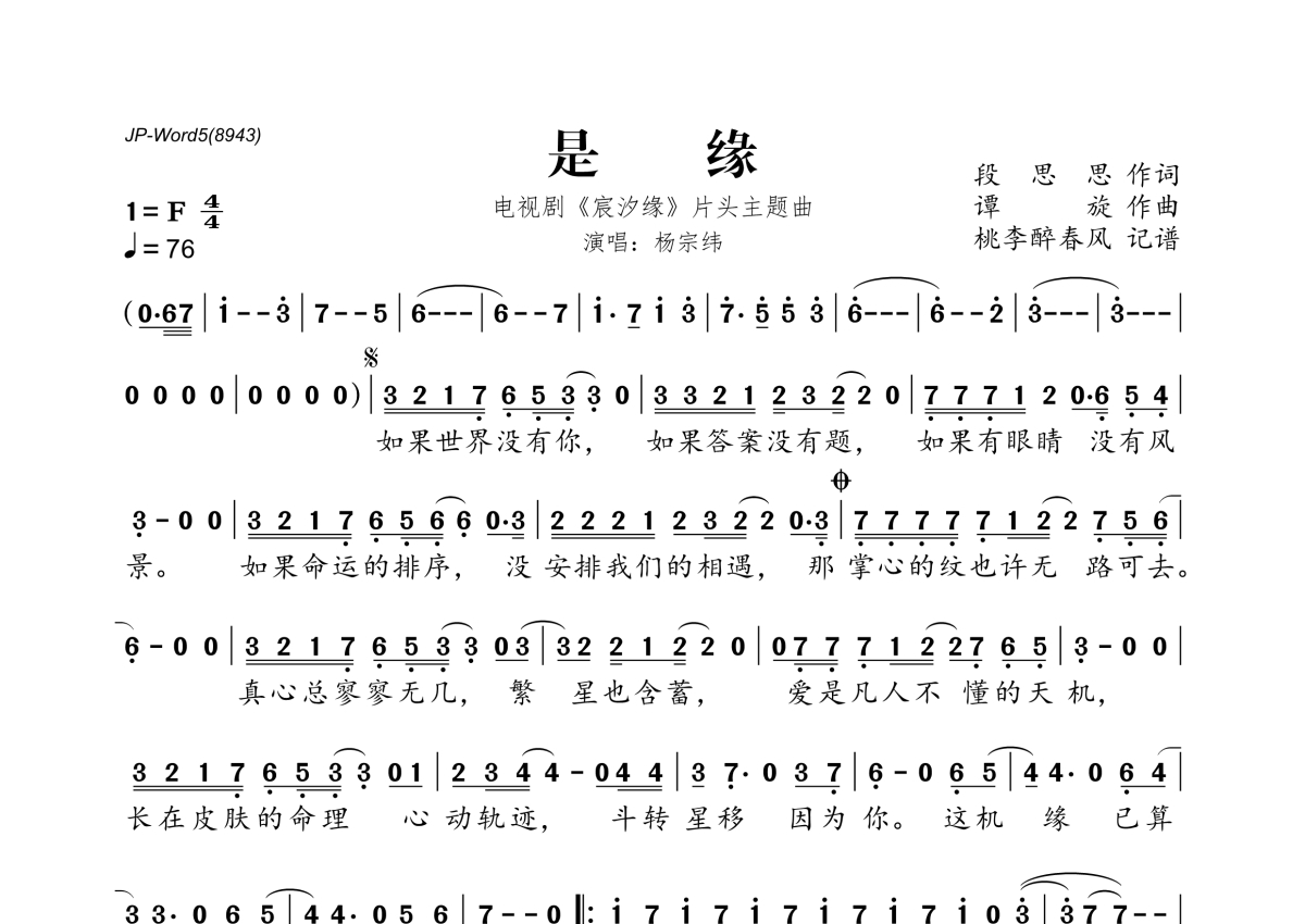 《是缘》是杨宗纬演唱的一首歌曲,拍号为4/4拍,歌曲速度为每分钟76拍,这份简谱共有一张高清图谱,图谱由 @桃李醉春风 编配上传。
