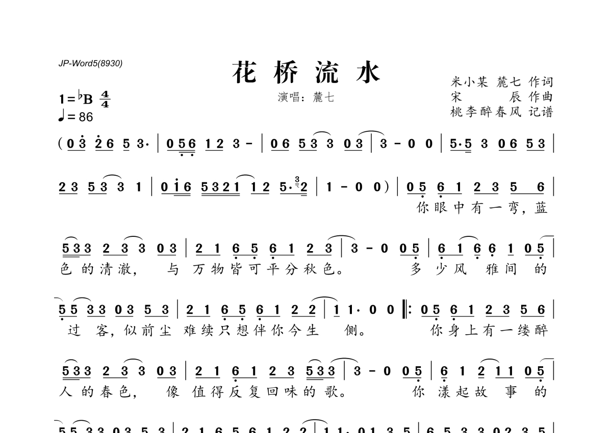 《花桥流水》是麓七演唱的一首歌曲,拍号为4/4拍,歌曲速度为每分钟86拍,这份简谱共有一张高清图谱,图谱由 @桃李醉春风 编配上传。