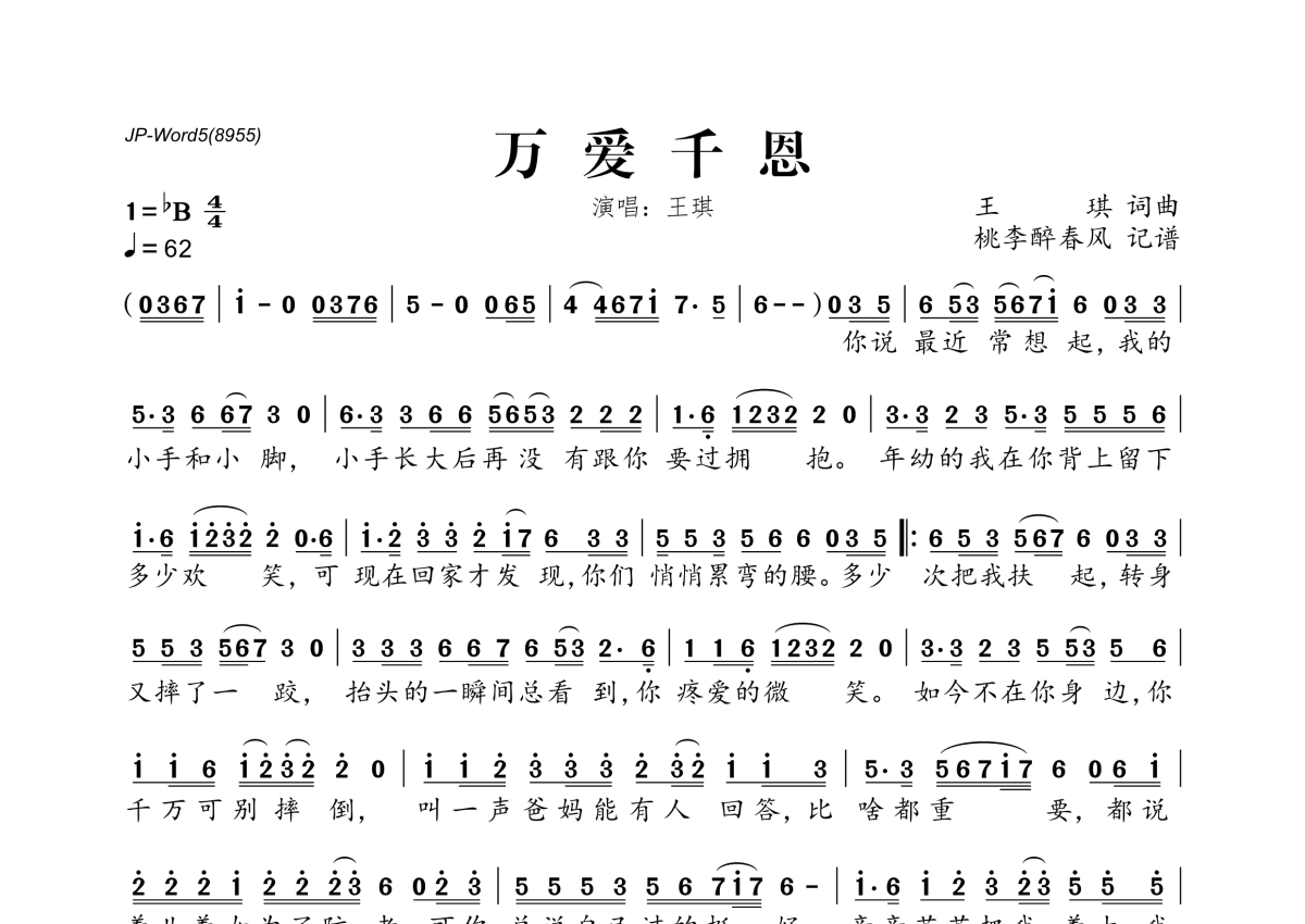 《万爱千恩》是王琪演唱的一首歌曲,拍号为4/4拍,歌曲速度为每分钟62拍,这份简谱共有一张高清图谱,图谱由 @桃李醉春风 编配上传。