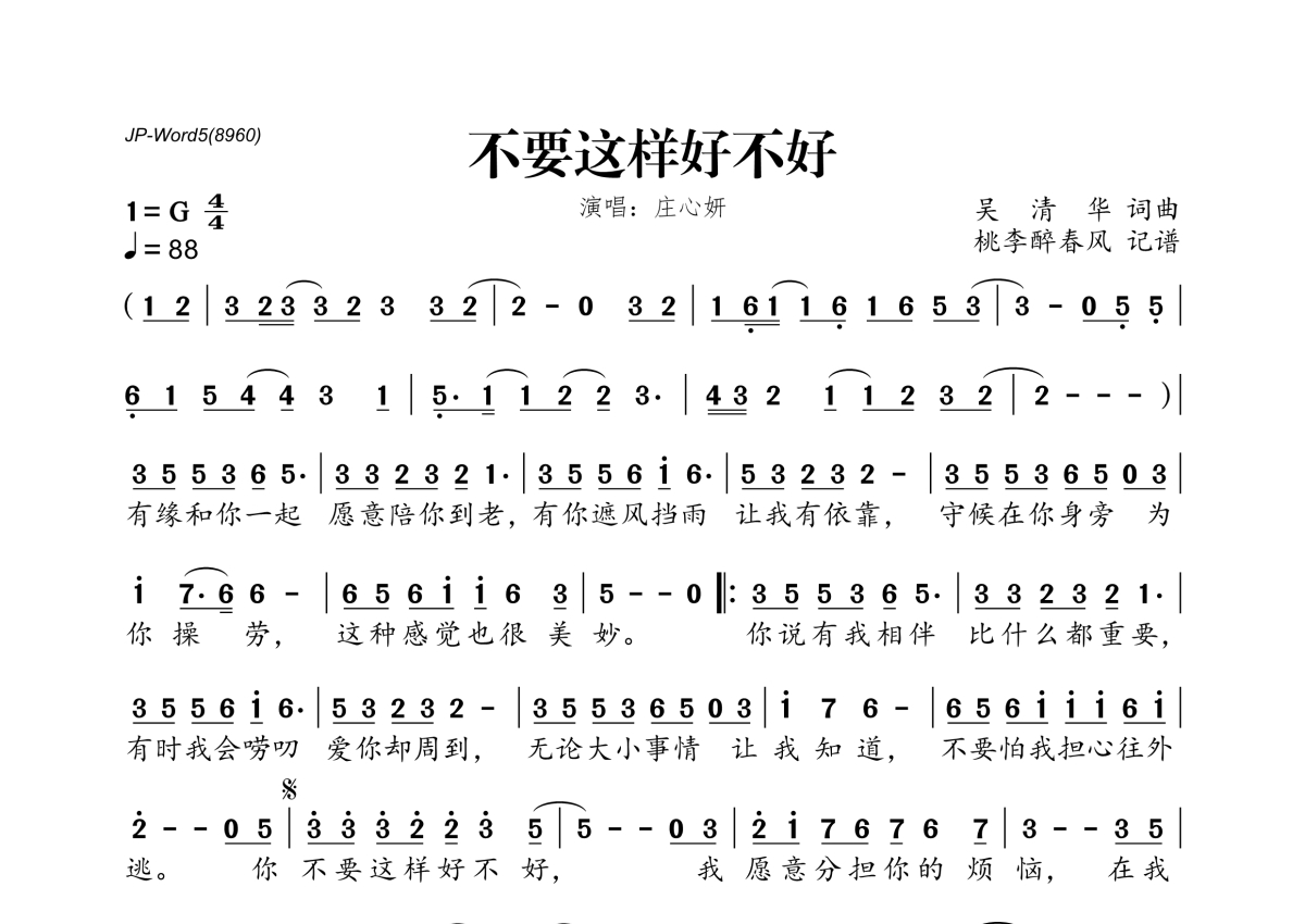 《不要这样好不好》是庄心妍演唱的一首歌曲,拍号为4/4拍,歌曲速度为每分钟88拍,这份简谱共有一张高清图谱,图谱由 @桃李醉春风 编配上传。