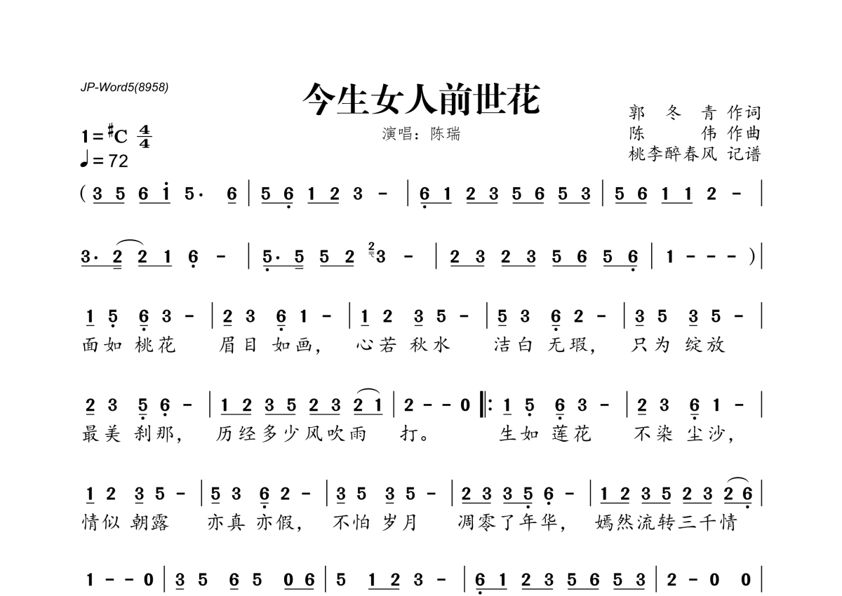 《今生女人前世花》是陈瑞演唱的一首歌曲,拍号为4/4拍,歌曲速度为每分钟72拍,这份简谱共有一张高清图谱,图谱由 @桃李醉春风 编配上传。