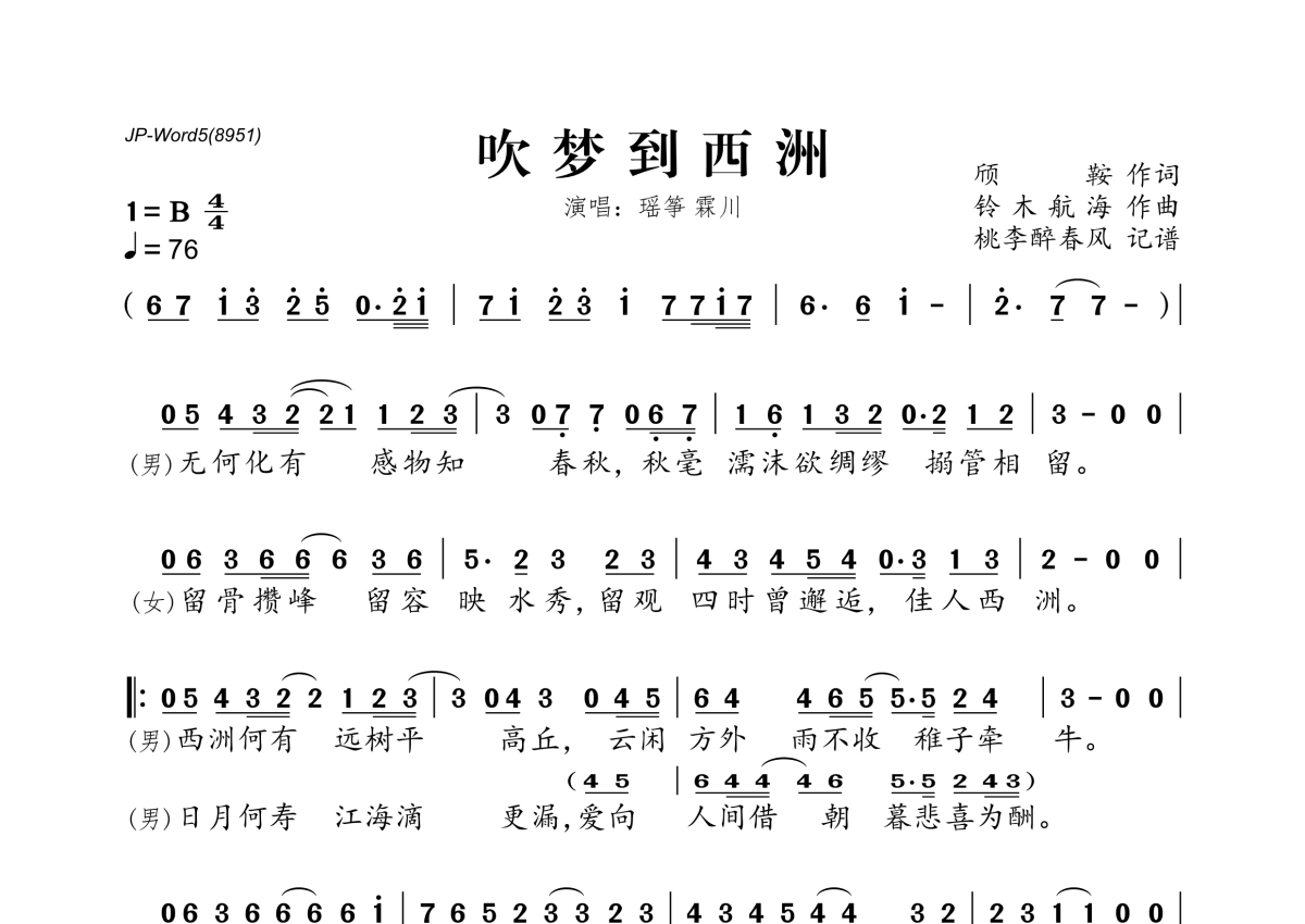 《吹梦到西洲》是瑶筝&霖川演唱的一首歌曲,拍号为4/4拍,歌曲速度为每分钟76拍,这份简谱共有两张高清图谱,图谱由 @桃李醉春风 编配上传。