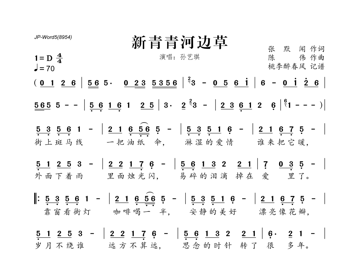 《新青青河边草》是孙艺琪演唱的一首歌曲,拍号为4/4拍,歌曲速度为每分钟70拍,这份简谱共有一张高清图谱,图谱由 @桃李醉春风 编配上传。