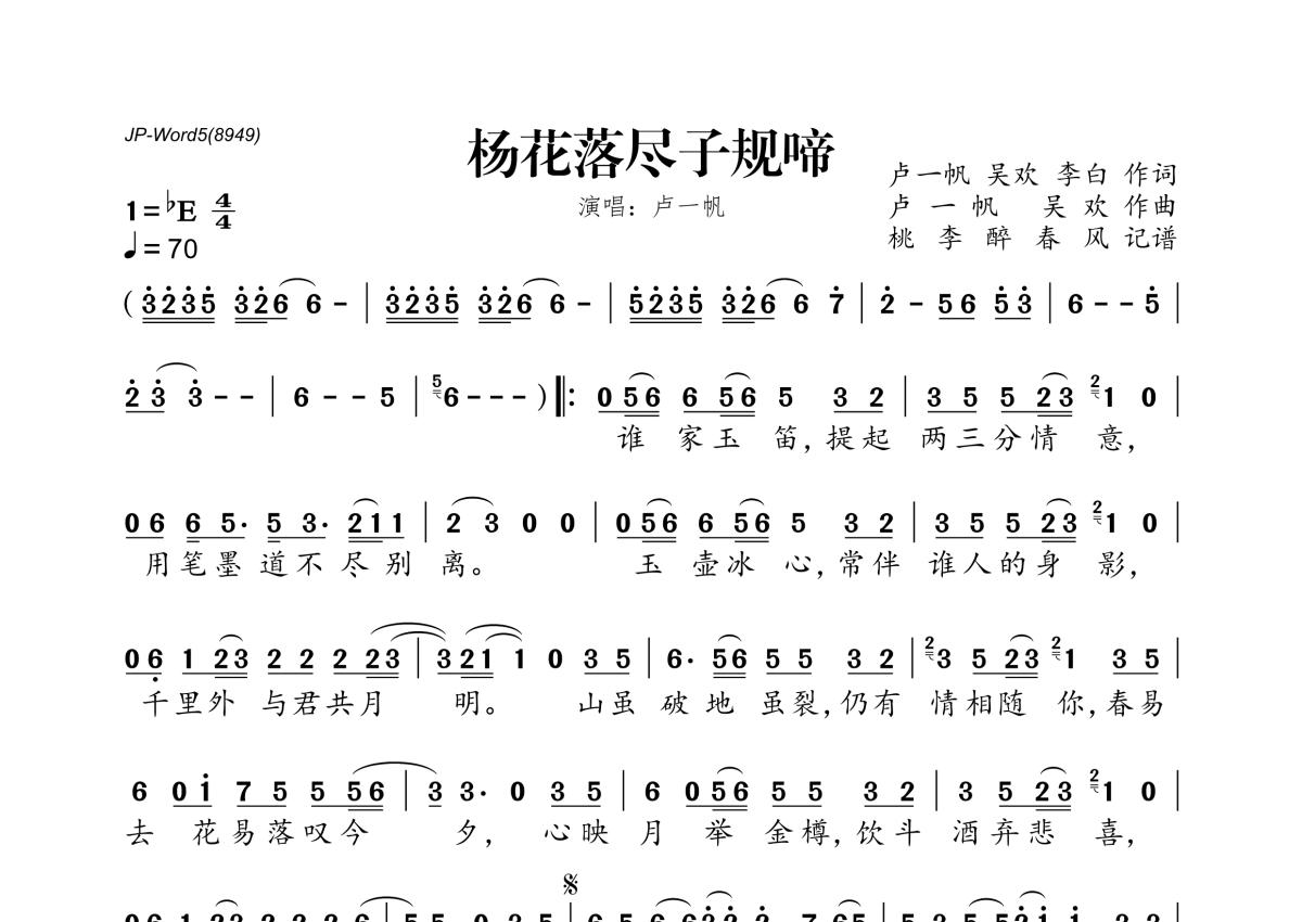 《杨花落尽子规啼》是卢一帆演唱的一首歌曲,拍号为4/4拍,歌曲速度为每分钟70拍,这份简谱共有一张高清图谱,图谱由 @桃李醉春风 编配上传。