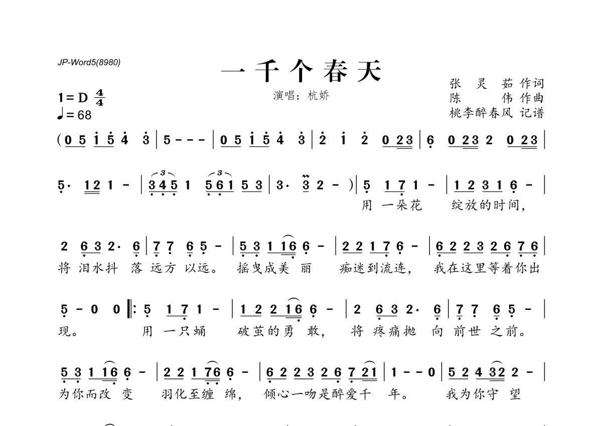 《一千个春天》是杭娇演唱的一首歌曲,拍号为4/4拍,歌曲速度为每分钟68拍,这份简谱共有一张高清图谱,图谱由 @桃李醉春风 编配上传。
