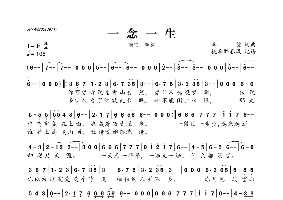 《一念一生》是李健演唱的一首歌曲,拍号为3/4拍,歌曲速度为每分钟106拍,这份简谱共有一张高清图谱,图谱由 @桃李醉春风 编配上传。
