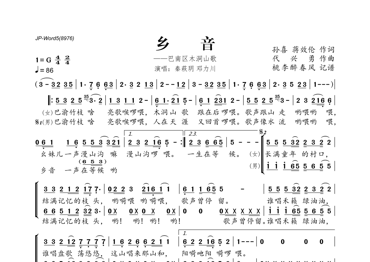 《乡音》是秦萩玥&邓力川演唱的一首歌曲,拍号为4/4拍,歌曲速度为每分钟86拍,这份简谱共有一张高清图谱,图谱由 @桃李醉春风 编配上传。