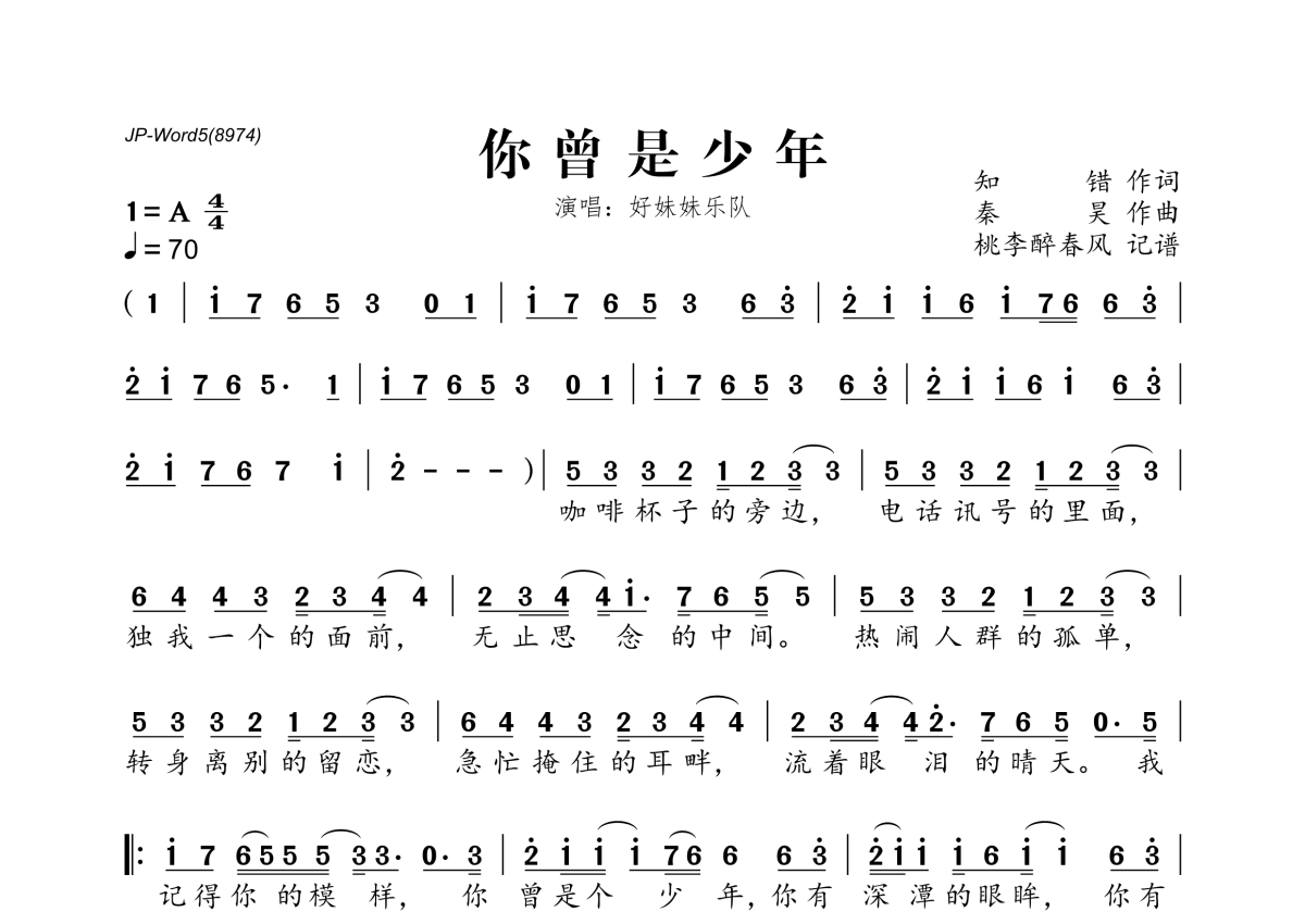 《你曾是少年》是好妹妹乐队演唱的一首歌曲,拍号为4/4拍,歌曲速度为每分钟70拍,这份简谱共有一张高清图谱,图谱由 @桃李醉春风 编配上传。