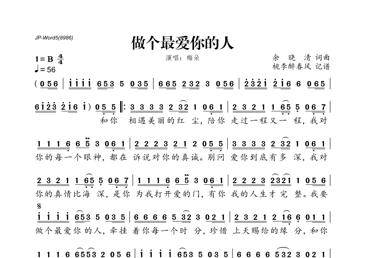 《做个最爱你的人》是梅朵演唱的一首歌曲,拍号为4/4拍,歌曲速度为每分钟56拍,这份简谱共有一张高清图谱,图谱由 @桃李醉春风 编配上传。