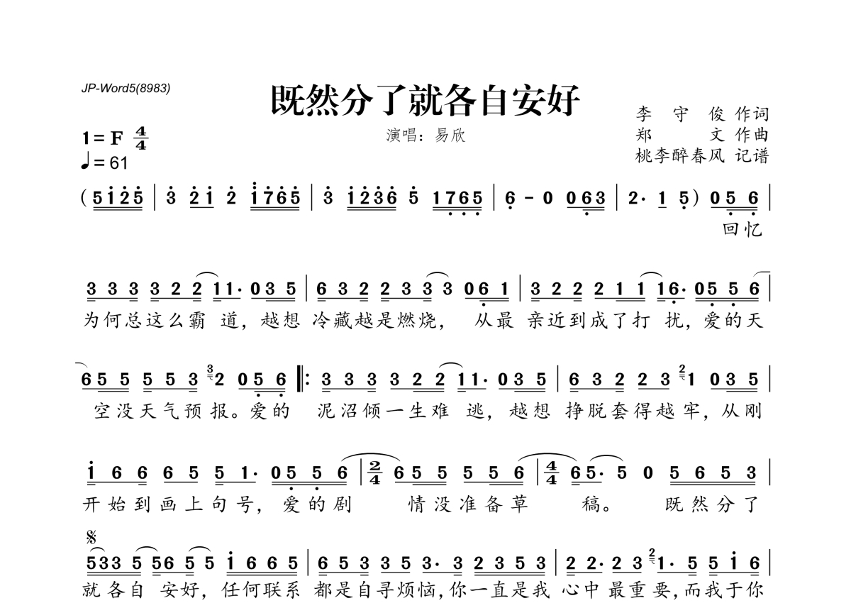 《既然分了就各自安好》是易欣演唱的一首歌曲,拍号为4/4拍,歌曲速度为每分钟61拍,这份简谱共有一张高清图谱,图谱由 @桃李醉春风 编配上传。